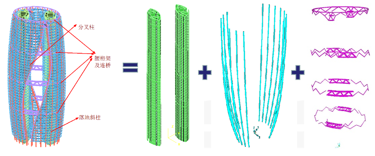項(xiàng)目組同時(shí)進(jìn)行了施工模擬分析、連續(xù)倒塌分析、彈塑性有限元分析并配合施工圖單位完成了BIM建模,還針對(duì)施工中復(fù)雜的構(gòu)造要求、特殊做法等,完成了施工圖及施工顧問(wèn)工作。
