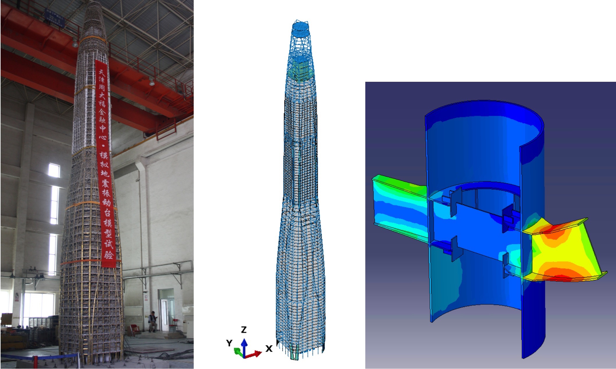作為國內建筑業科技發展的引領者,建研科技在全專業建筑設計與咨詢綜合解決方案方面具有豐富的經驗,承擔了天津周大福金融中心的多項高難度技術服務和咨詢工作,為項目的順利實施提供了技術支撐:開展了主塔樓的模擬地震振動臺模型試驗,檢驗結構的抗震性能,確保了主塔的抗震安全性;完成了主塔樓的獨立第三方動力彈塑性分析復核計算,尋找結構的薄弱層或薄弱部位,為結構抗震設計提供改進建議;通過有限元分析手段,對受力不利構件進行復雜節點內力分析及節點抗震性能驗算;對施工圖中涉及的復雜構造要求、特殊做法試驗方案、設計變更審核等內容進行了施工圖獨立第三方結構審計和顧問工作。