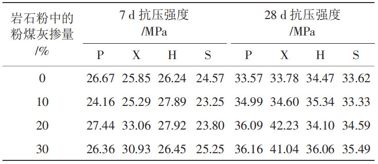 由上表可知,片麻巖石粉水泥膠砂的 7 d 抗壓強度在20%粉煤灰摻量下略有提高,其它摻量下有所下降,28 d 抗壓強度隨著粉煤灰摻量的增加而提高;粉煤灰對玄武巖石粉水泥膠砂 7 d 和 28 d 的抗壓強度影響規律相似,均在粉煤灰20%摻量時達到最大;摻粉煤灰對花崗巖石粉和石灰石粉水泥膠砂 7 d 和 28 d 的抗壓強度影響較小,粉煤灰摻量改變,抗壓強度變化范圍在 2 MPa 以內,敏感性較差。