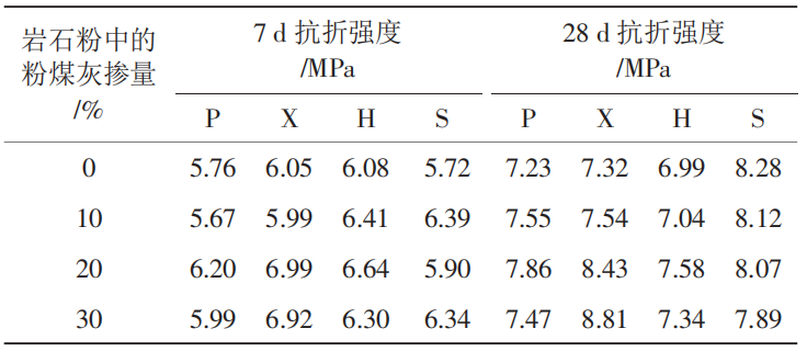 表2:不同巖石粉與粉煤灰復合對膠砂抗折強度的影響