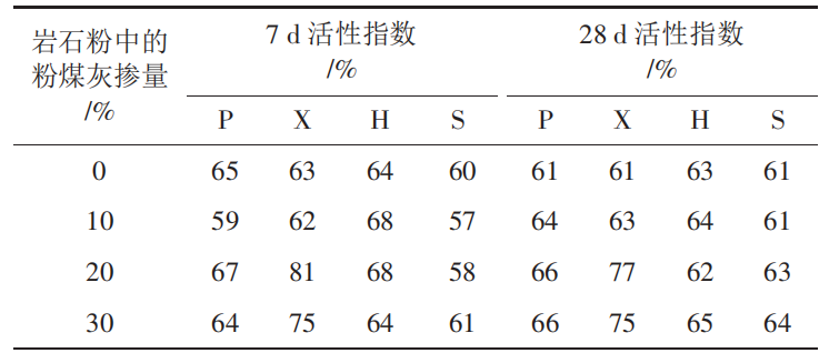 (2)在粉煤灰摻量較小的情況下,不同巖石粉對粉煤灰的敏感度不一樣。玄武巖石粉的敏感度最大,粉煤灰摻量改變,玄武巖石粉組活性指數最大值比最小值增加了 30%,其它巖石粉組則均在 10%范圍以內。