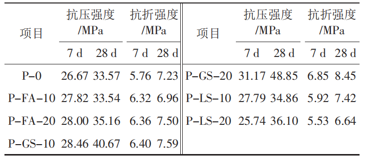 由上表可知,隨著各摻合料摻量的增加,除摻石灰石粉組7 d 抗壓強度呈降低趨勢外,其它組抗壓強度均提高;礦渣粉組對強度提升程度最大,礦渣粉摻量 10%組 28 d 抗壓強度較P-O 組提升 21%,20%摻量提升 46%,粉煤灰組和石灰石粉組抗壓強度隨摻合料摻量增加增幅不明顯。抗折強度發展規律為:礦渣粉組的抗折強度最高,石灰石粉組最差,隨摻量增加,除石灰石粉 7 d 強度下降外其它組均呈增長趨勢。7 d 抗折強度增長規律為:礦渣粉組正增長、粉煤灰組基本不變、石灰石粉組負增長;28 d 抗折強度發展規律:各組均隨摻量增加而提高,礦渣粉組的強度最高,粉煤灰組和石灰石粉組基本保持一致。
