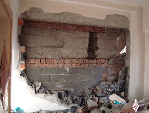 施工模板等雜物填塞防震縫,相鄰兩棟建筑地震時相互碰撞、擠壓,導致其中一棟建筑的填充墻倒塌