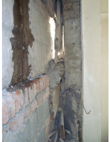 (a) 防震縫寬度不夠,高低建筑相互碰撞造成墻體破壞