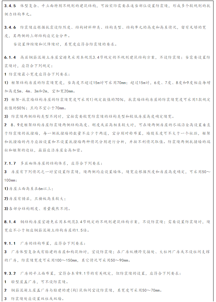 我國的10規(guī)范(《建筑抗震設計規(guī)范》GB 50011-2010)在第3.4.5條給出了防震縫設置的一般規(guī)定,同時,在第6.1.4條、7.1.7條、8.1.4條、9.1.1條和9.3.2條等處分別對鋼筋混凝土房屋、砌體結構房屋、鋼結構房屋、鋼筋混凝土廠房以及單層磚柱廠房等防震縫設置進行了規(guī)定。