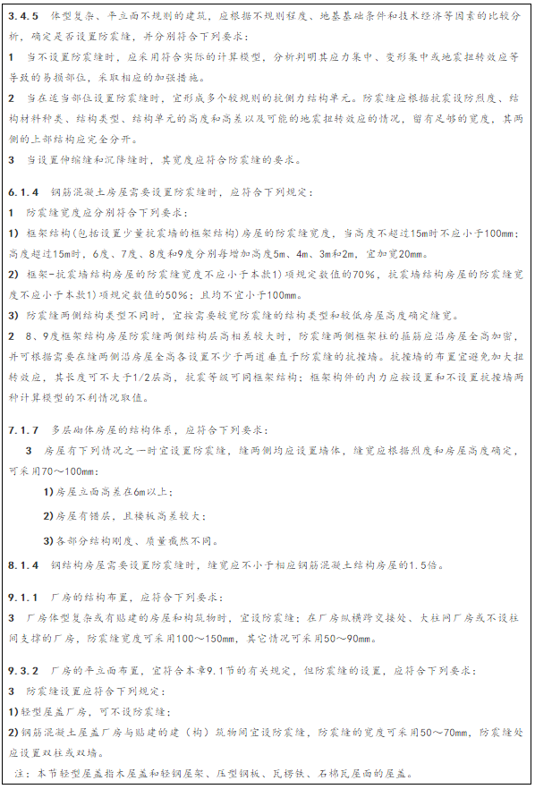 我國的01規(guī)范(《建筑抗震設計規(guī)范》GB 50011-2001)在第3.4.5、3.4.6條給出了防震縫設置的一般規(guī)定,同時,在第6.1.4條、7.1.7條、8.1.4條、9.1.1條和9.3.2條等處分別對鋼筋混凝土房屋、砌體結構房屋、鋼結構房屋、鋼筋混凝土廠房以及單層磚柱廠房等防震縫設置進行了規(guī)定。