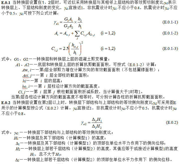 圖E 轉(zhuǎn)換層上、下等效側(cè)向剛度計(jì)算模型 E.0.3 ?當(dāng)轉(zhuǎn)換層設(shè)置在第2層以上時,按本規(guī)程(3.5.2-1)式計(jì)算的轉(zhuǎn)換層與其相鄰上層的側(cè)向剛度比尚不應(yīng)小于0.6。 |