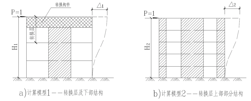 由于這種算法沒有考慮結(jié)構(gòu)體系中支撐斜桿及水平桿件(比如連梁等)的剛度貢獻(xiàn),也沒有考慮上下樓層的約束作用,因此,其適用范圍有一定局限。《高層建筑混凝土結(jié)構(gòu)技術(shù)規(guī)程》規(guī)定,該方法主要用于轉(zhuǎn)換層位于底部一、二層時,轉(zhuǎn)換層上下剛度比驗(yàn)算及結(jié)構(gòu)嵌固條件復(fù)核。