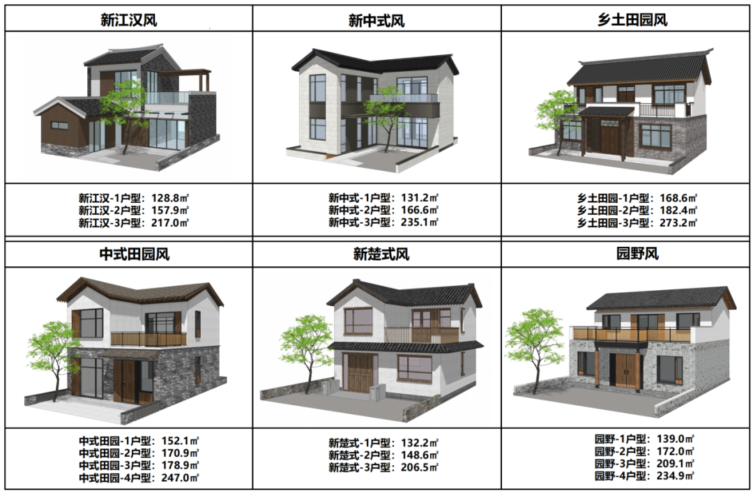 按照“功能現代、結構安全、成本經濟、綠色環(huán)保、與鄉(xiāng)村環(huán)境相協(xié)調的宜居住房”的總體目標,在試點示范建設中,根據其他不同村灣的特點,和未來閑置農房改造民宿的需求,設計了另外五種不同的建筑風貌,形成《湖北省大冶市現代宜居農房戶型圖集》。