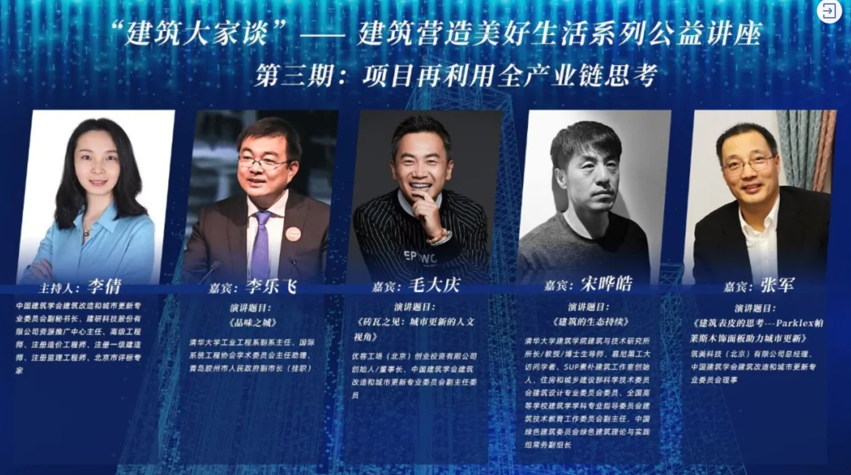 此次系列講座特別邀請了國內(nèi)建筑行業(yè)知名學(xué)者、專家、企業(yè)家、建筑評論家共聚一堂,探討如何讓建筑從更加綜合、同時(shí)也更加細(xì)致的維度,帶給人們更新的生活感受,從而推動(dòng)城市的更新和復(fù)蘇。此次講座由中國建筑學(xué)會(huì)建筑改造和城市更新專業(yè)委員會(huì)副秘書長李倩主持。