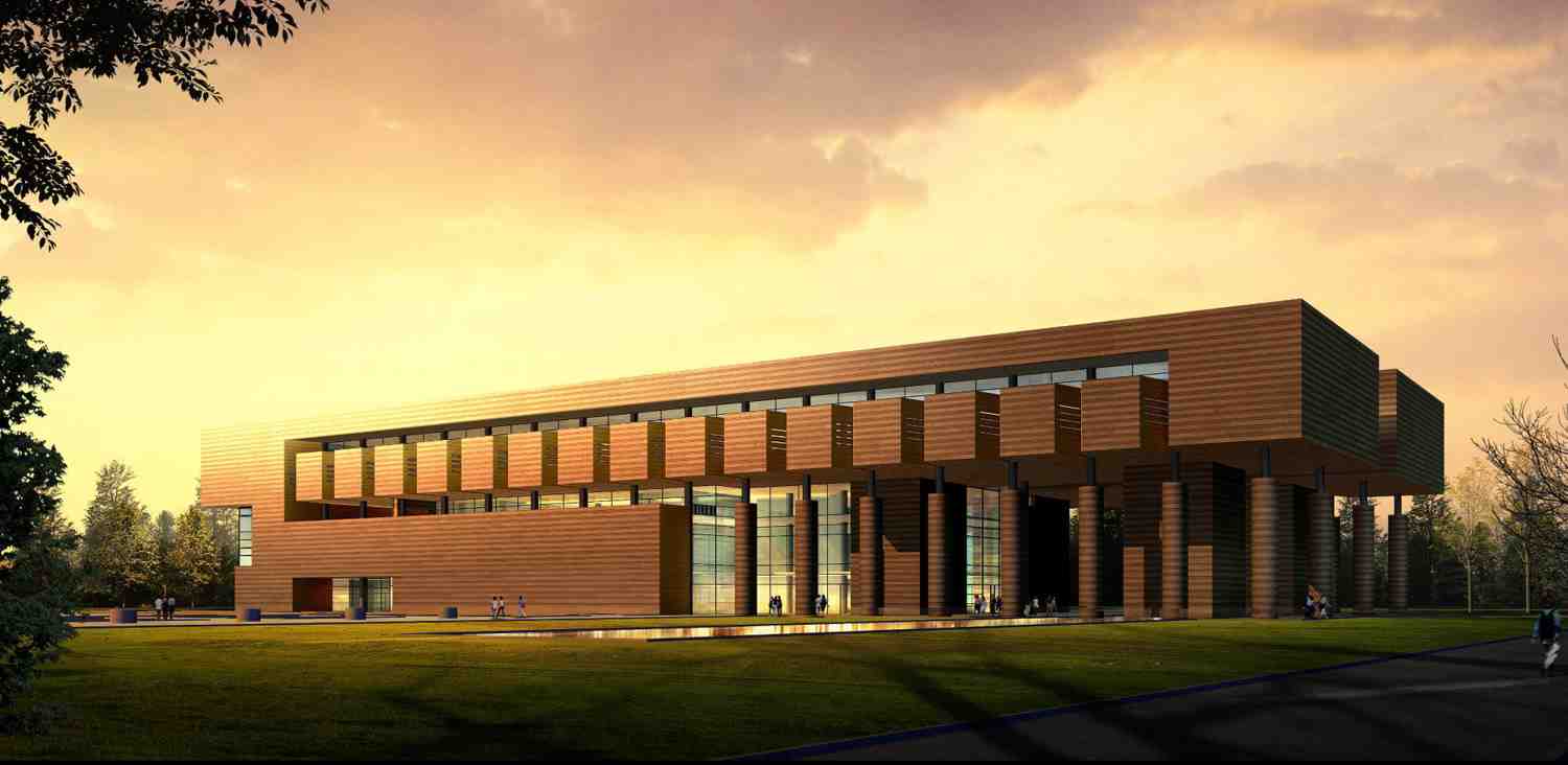總平面布局設計結合校園總體規劃及周邊環境,充分考慮地段的合理化、最大化應用,將建筑平面布置為東西向長、南北向短的矩形。建筑東部結合入口布置高度為14.3米的大型室外柱廊,與南側美術學院廣場及東側城市綠化帶形成空間的延續及景觀上的滲透,并將室外空間有效的引入了室內接待門廳。參觀人流可以從南、北、東三個方向方便的進入博物館。建筑設計具有典型的“提契諾學派”建筑設計風格:采用“減法”的設計思路,從整體巨石中雕刻出體量簡潔、虛實對比強烈的建筑形體。注重自然光線在建筑室內、室外的運用,體現了建筑簡潔、明確、有力而內向的建筑風格。