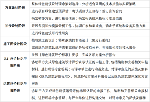 隨即開展的綠色建筑咨詢工作將與項目的設計工作進程緊密結合。在方案設計階段將與業主展開廣泛交流以確定綠色建筑整體方案,如建筑冷熱源方案,可再生能源建筑利用方案等。在初步設計、擴初設計及施工圖設計階段中,咨詢團隊將與業主及設計單位緊密合作,以確保綠色建筑整體方案落到實處。